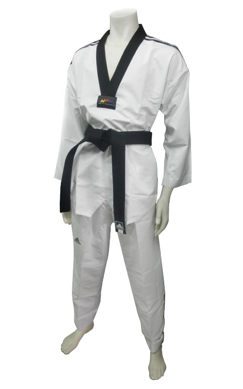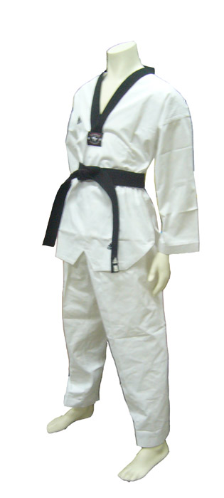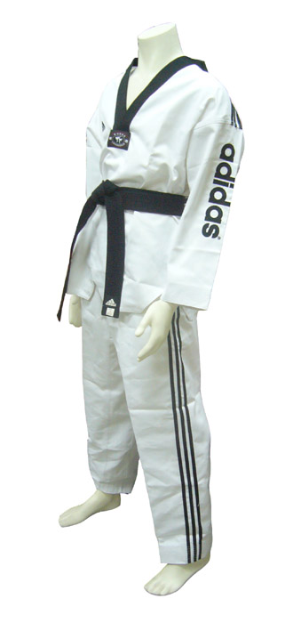 This adidas uniform is officially approved by the World Taekwondo Federation (WTF). It is made of 55% cotton 45% polyester which features woven criss-cross three vertical stripe pattern to emphasize the famous three stripes of adidas. It has a black collar. The pants have the elastic waistband and drawstring. There is no printing at the back of the jacket.