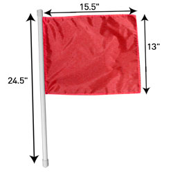 Official Flag attached to a white pvc stick. Red/yellow/white colours available in flag. - Stick length = 24.5" - Flag size = 15.5" x 13" Sold per piece.