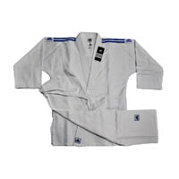 60:40 CVC cotton polyester blended briliant white bleached single weave Judo with 1-line diamond design single woven improved skirt. Adidas stripes on both shoulders.Judo pants in 55:45 CVC blended drill fabric with soft elastic waist band and rest with drawstrings. Including belt.