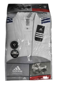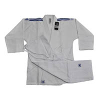 60:40 CVC cotton polyester blended briliant white bleached single weave Judo with 1-line diamond design single woven improved skirt. Adidas stripes on both shoulders.Judo pants in 55:45 CVC blended drill fabric with soft elastic waist band and rest with drawstrings.