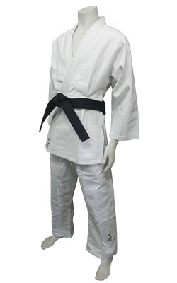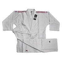 60:40 CVC cotton polyester blended briliant white bleached single weave Judo with 1-line diamond design single woven improved skirt. Adidas stripes in red colour on both shoulders.Judo pants in 55:45 CVC blended drill fabric with soft elastic waist band and rest with drawstrings. Including belt.